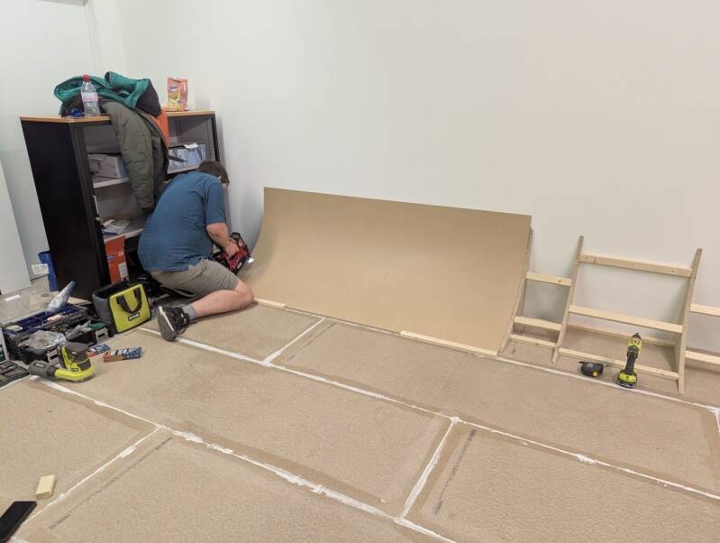 - Boden zur schwarzen und grünen Wand ist verlegt.